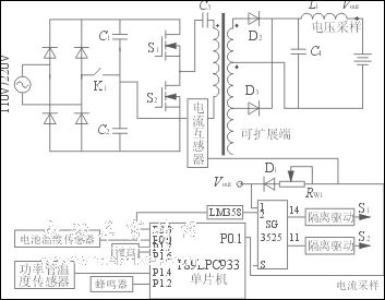 由于铅酸蓄电池维护简单、价格低廉、供电可靠、使用寿命长,广泛作为汽车、飞机、轮船等机动车辆或发电机组的启动电源,也在各类需要不间断供电的电子设备和便携式仪器仪表中用作一些电器及控制回路的工作电源。随着经济的发展,大容量蓄电池的应用迅速增加,人们希望能快捷、安全地对蓄电池进行充电,而现有市场销售的充电器充电电流多为20A。为了满足人们对大功率充电器的需求,设计了一款基于LPC933 充电电流50A、充电功率740W、功能完善、可扩充的智能充电器。